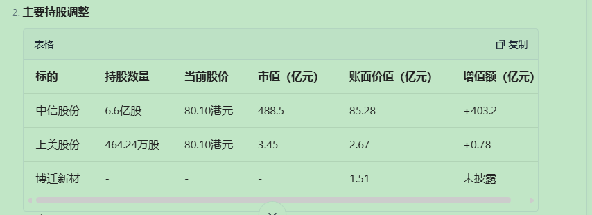 标的持股数量当前股价市值(亿元)账面价值(亿元)增值额(亿元)中信股份6.6亿股80.10港元488.585.28+403.2上美股份464.24万股80.10港元3.452.67+0.78博迁新材---1.51未披露