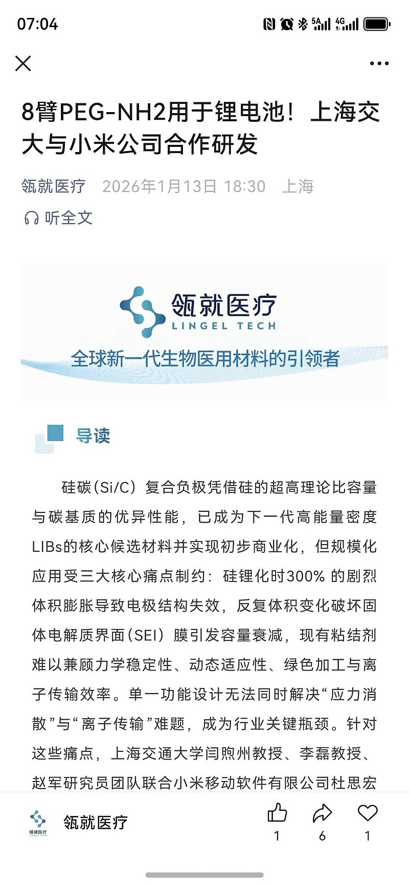 聚乙二醇用在锂电池上了。海量市场空间了。