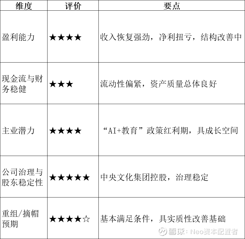 公司目前仍带“*ST”标识,但根据报告期连续三个季度盈利、净资产为正、主业恢复增长,摘帽概率显著上升。其国资控股背景及AI教育业务被纳入“中央文化科技融合重点企业”,具备潜在的政策与资本重组逻辑。 未来可能路径包括: