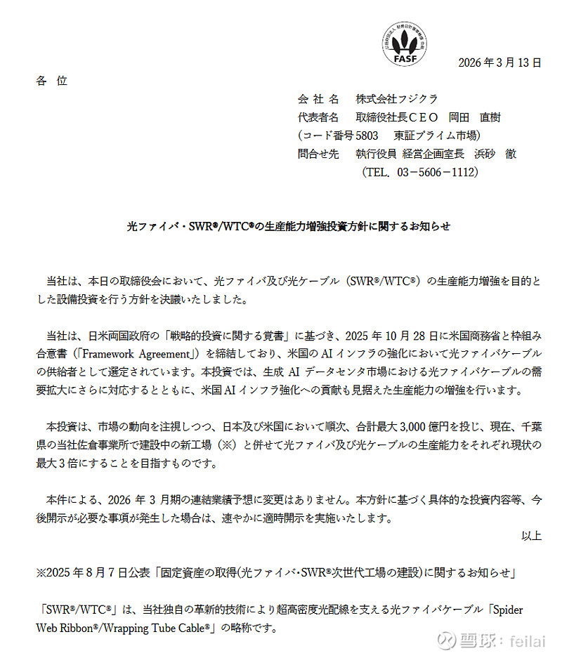 AFL即藤仓:AFL正是日本藤仓(Fujikura)在美国的子公司 。这意味着,藤仓的扩产计划与其子公司AFL的业务紧密相连,而蘅东光作为AFL的核心供应商,将直接受益于这场由母公司主导的产能扩张。