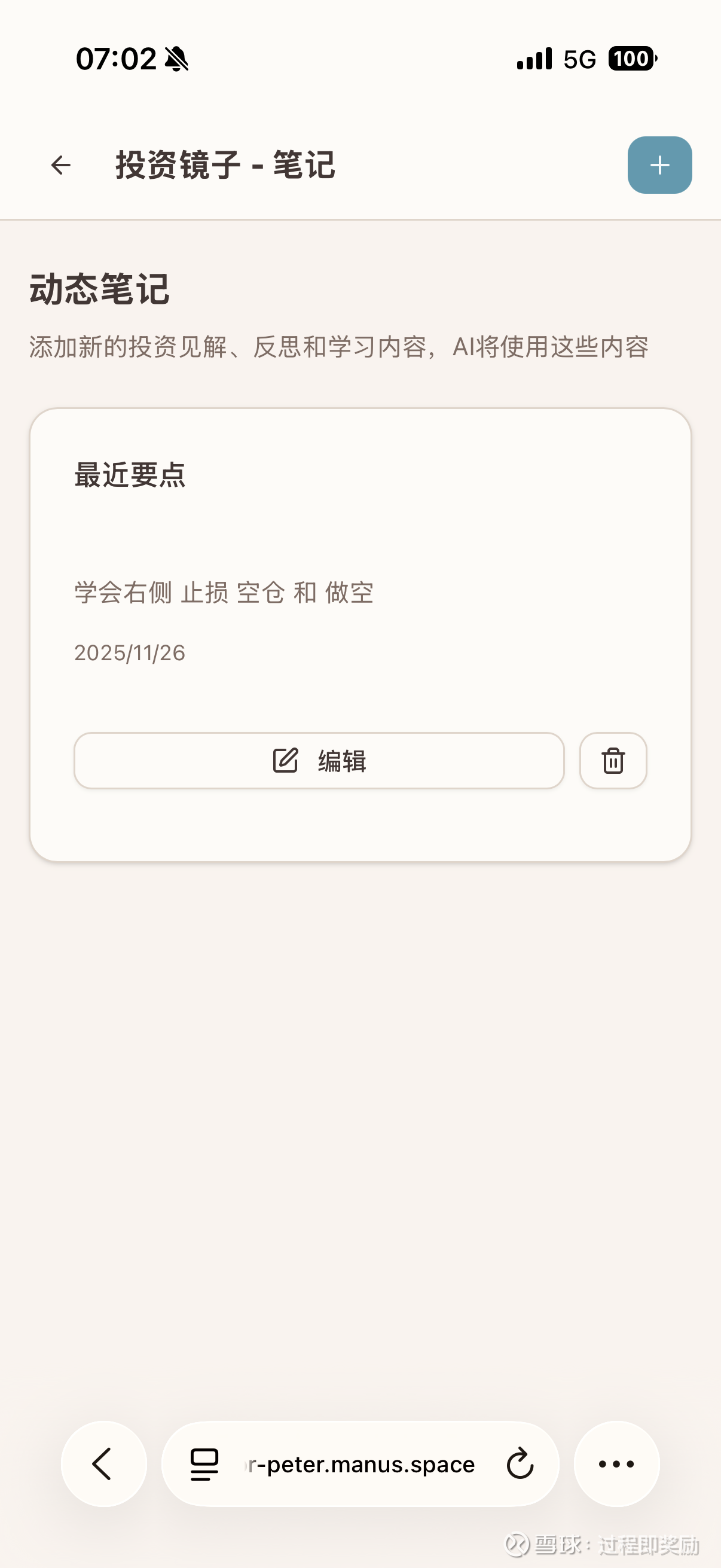 最近真的有在反思之前做的一些操作。然后也像昨天所说的,其实做的最差的在于说是止损,包括说是空仓,包括说是做空和右侧交易。那么这些事情,在风和的这个演讲和他说的这些书里面其实都有很好的阐述。所以自己也录了这么多期的播客,做了这么多的投资笔记,也做了很多的性格测试和自我描述。因此,我特别希望能够构建一个属于自己的投资助理。