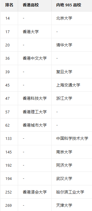这里面让人困惑的就是大学排名。如果大家去查看香港的大学排名,会发现香港的大学在全世界QS排名里面是非常靠前的。这里面有一张表可以供大家参考,一个是香港本地大学排名,一个是国内部分知名985在世界的QS排名。