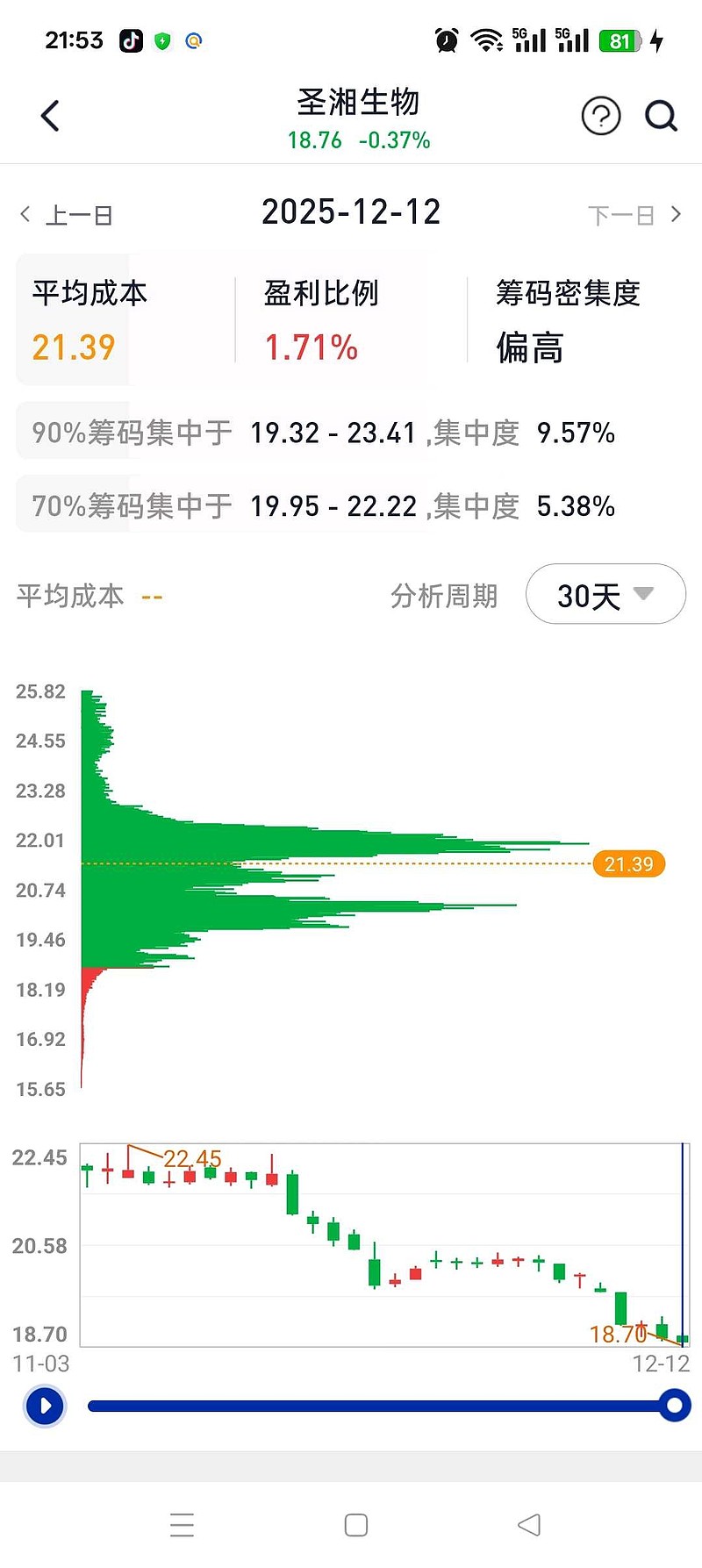 · 绝大部分筹码被锁定:90%的筹码集中于19.32 - 23.41元,集中度9.57%。这说明在过去30天的分析周期内,绝大多数交易都发生在这个不到4.1元的空间内,形成了一个密集的筹码峰。