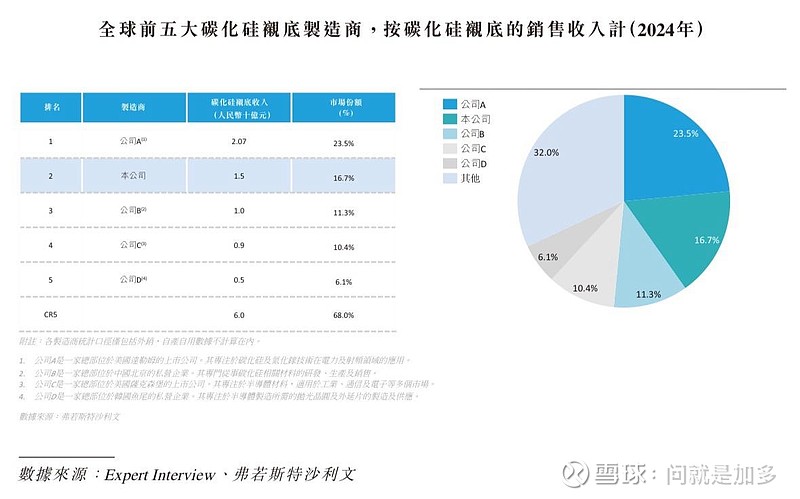 公司是全球宽禁带半导体材料行业的领军企业,自成立以来即专注于高质量碳化硅衬底的研发与产业化。根据弗若斯特沙利文的资料,按2024年碳化硅衬底的销售收入计,公司是全球排名前三的碳化硅衬底制造商,市场份额为16.7%。