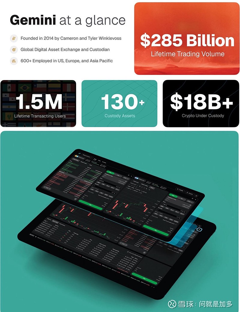 Gemini(注册实体为GeminiSpace Station, Inc.)由Winklevoss双胞胎创立,是全球领先的加密货币交易平台之一,服务范围涵盖交易、稳定币发行、托管、质押、加密奖励信用卡等,用户超过多百万,资产与交易量庞大。