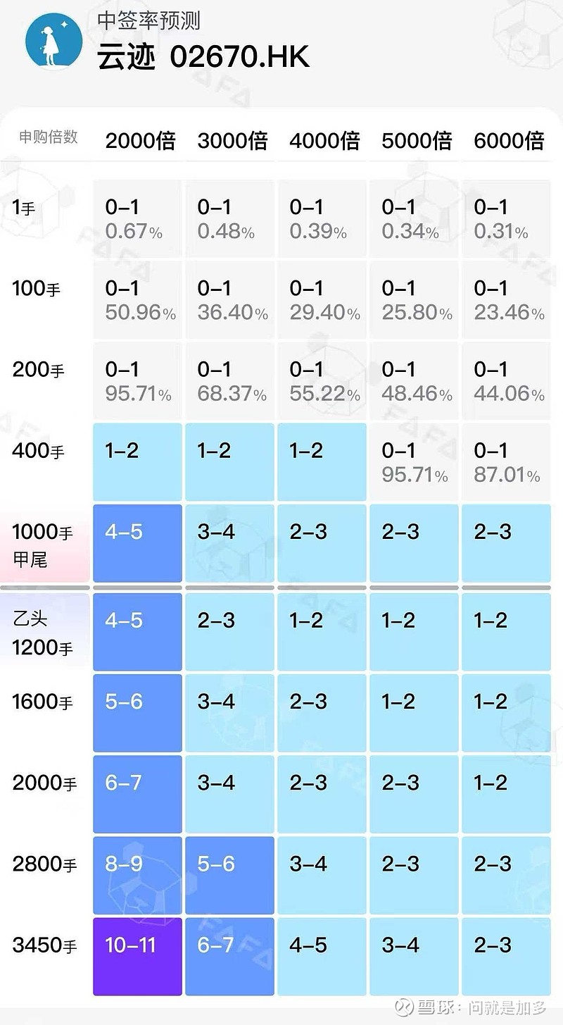 这次云迹发行了10%的股份,肯定孖展会超过50倍,那么回拨20%的情况下,有1.3亿左右的货,甲乙共27600手。这样看,这次中签率应该比之前的新股能高个2倍左右,之前的新股大多都是1.1-1.2万手左右。