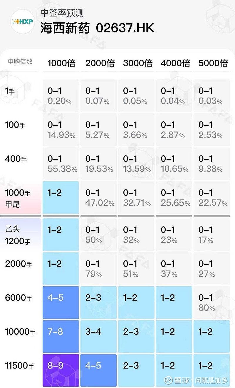 这次海西新药发行了14.61%的股份,实行交易所“B机制”,固定10%的公开份额,不启动回拨,仅仅只有9936万的货,甲乙共23000手。货量比轩竹多近1万手,由于:轩竹和 云迹冲突,云迹和海西冲突,轩竹和海西不冲突。这样云迹和海西的孖展倍数肯定不会有轩竹高,中签率相对来说应该会高一些,但是肯定也是抽奖。云迹和海西起码顶头槌应该能大概率稳中1手了。
