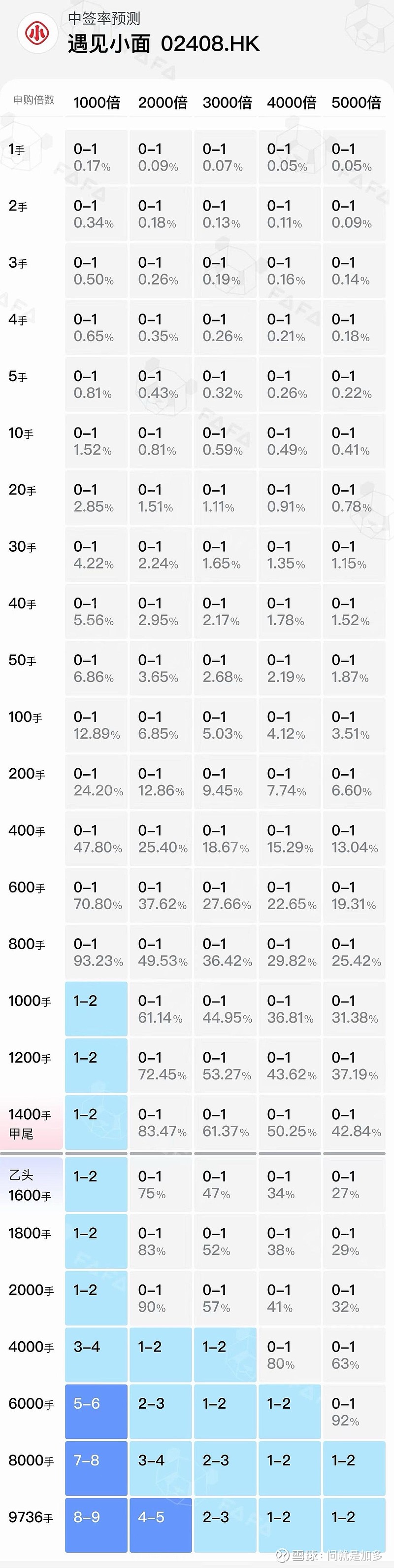 这次 $遇见小面 (02408.HK)$ 发行了13.7%的股份,实行交易所“B机制”,固定10%的公开份额,不启动回拨,大约有6854万的货,甲乙共18753手。货不少,但是估计中签率也不会很高,大概率和海伟差不多。
