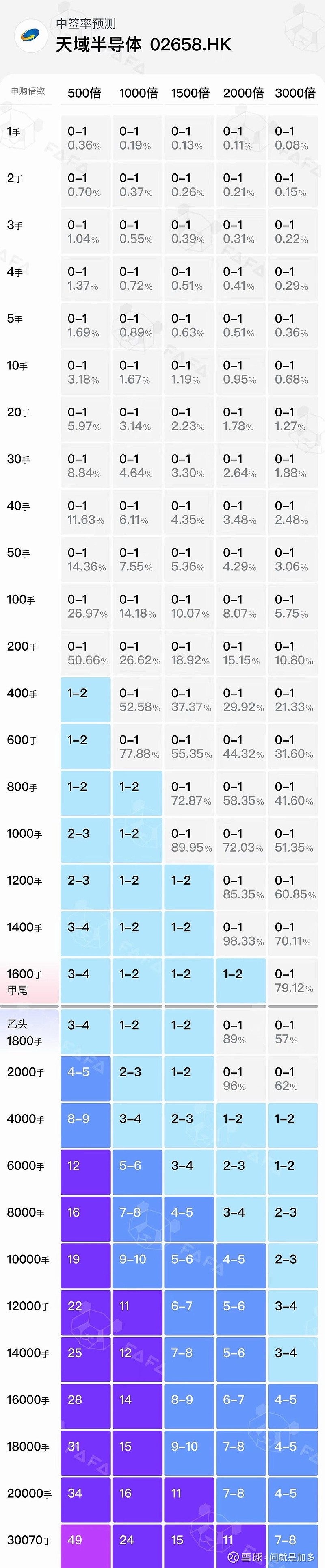 这次 $天域半导体 (02658.HK)$ 发行了7.65%的股份,实行交易所“B机制”,固定10%的公开份额,不启动回拨,大约有1.74亿的货,甲乙共60142手。货很多,一天过去了认购暂时只有10几倍,当然资金被今天截止的新股占用了,但是如果最终认购倍数起不来,那么中签率应该不会低。