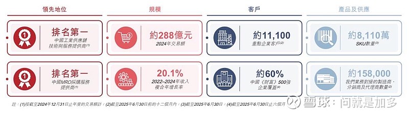 公司是中国领先的工业供应链技术与服务供应商,按2024年的交易额计,公司在中国MRO采购服务市场排名第一。公司在中国的工业供应链技术与服务市场拥有最广泛的客户覆盖,于2024年服务约11,100个重点企业客户。