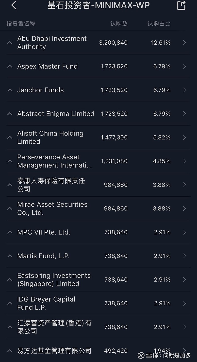 $MINIMAX-WP (00100.HK)$ 18C,孖展超50倍,回拨20%,那么甲乙一共253900手,货是真的多,因为一手价格只有3333,所以手数是智普的3倍多,而且认购截止是冲突,那么中签率不会低,25万手和壁仞科技的手数差不多,但是壁仞科技超1500倍了,MINI估计500倍都到不了,那么一手中签率大概率20%以上,认购100手以内就能中1手了。