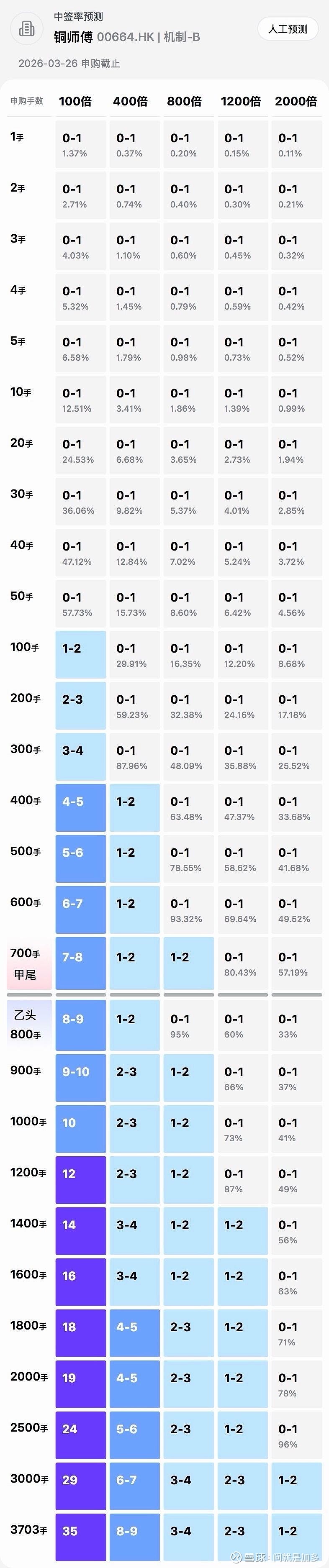 这批新股7个都冲突,很多人留给铜师傅的孖展估计不多,但是有500亿那么也有1000倍了,中签率也不会很高。如果在1000倍左右,那么甲尾乙头可能刚好也在稳1的边缘。