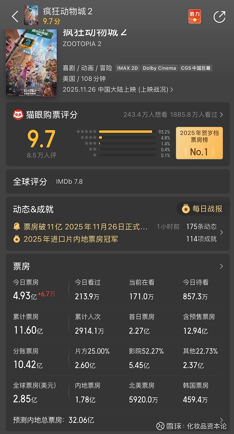 $迪士尼(DIS)$ 早上刷了影视飓风刚更新的视频,不愧是昨天b站播放量第一,很催泪又有深度思考。中午看了疯狂动物城,感觉第二部剧情确实差些新鲜感,但全程磕朱迪尼克CP,也算是提供了满满的情绪价值。想到影视飓风在视频里提到的,在这个AI把一切都变得更容易的时代,情绪价值仿佛变成了一种稀缺的东西。无论是抖音短视频,还是b站长视频,还是电影,最终比拼的就是情绪价值了。