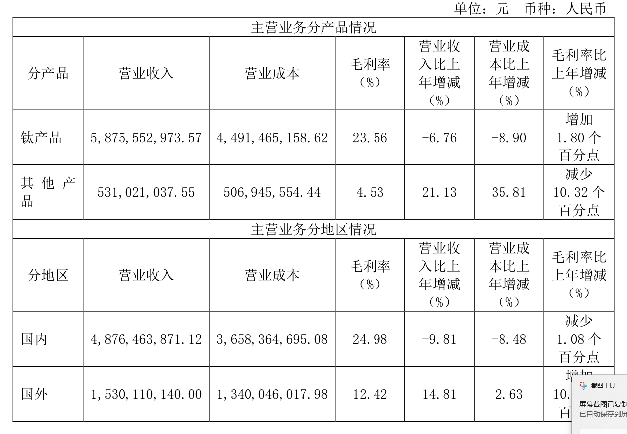 这家公司产品主要就是钛产品,是营业收入主要来源,另外公司国内的销售的毛利率是远高于国外的,这一点有点让人不舒服,卖给国外更便宜?这是不是他的产品在国际上没啥竞争力的意思,窝里横?