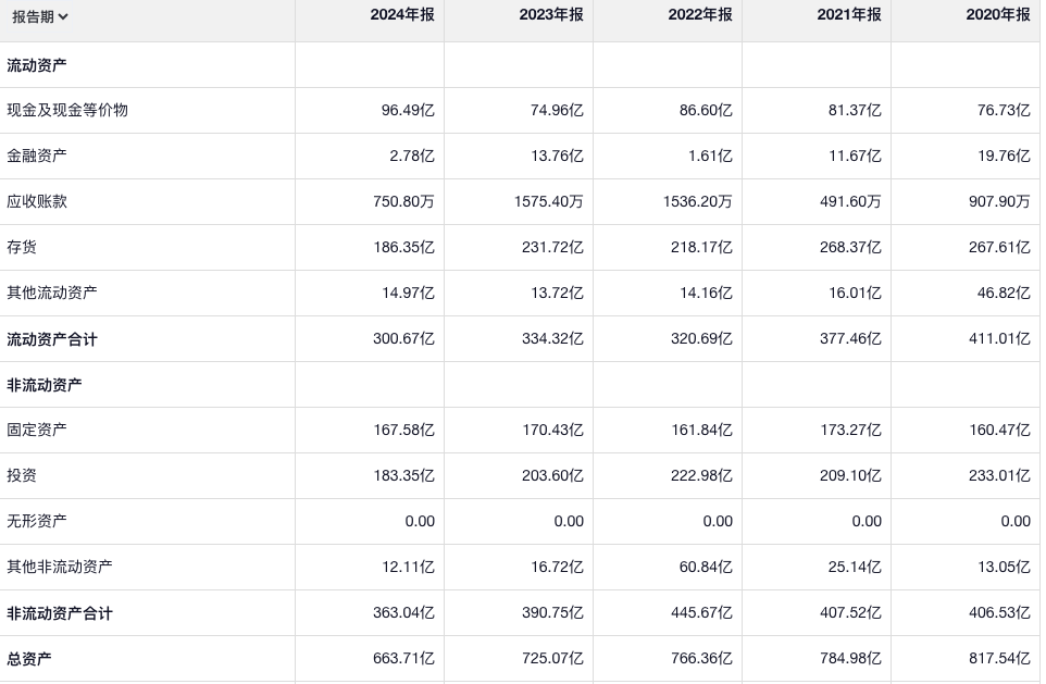 公司的现金变化不大,金融资产减少很多,存货减少很多,应收很少,固定资产变化不大,投资好庞大呀,