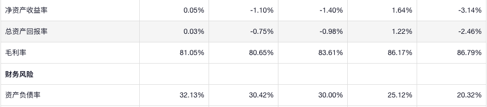 净资产收益率这一个指标一直都不是很高,毛利是很高的,负债率是比较低的,但是上升了不少。