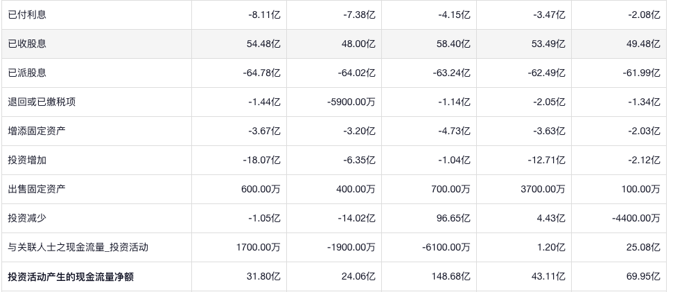 这个公司每年收到的股息是一笔很庞大的数字,每年都有分红,基本一年60多个亿。
