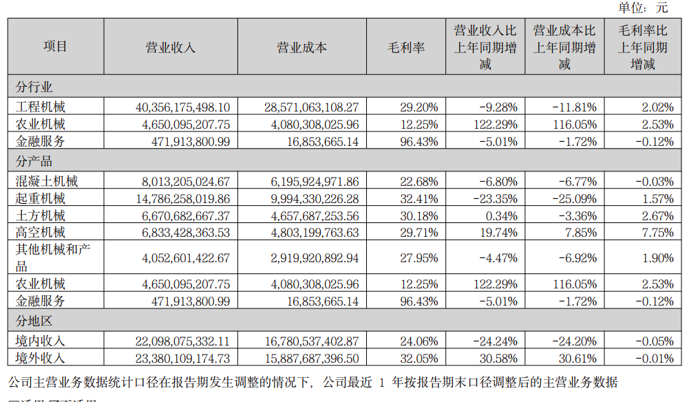 公司主要从事工程机械、农业机械和矿山机械的研发、制造、销售和服务。工程机械包括混凝土机械、起重机械、土石方施工机械、高空作业机械、桩工机械、应急救援装备、叉车等,主要为基础设施建设、房地产建设、采矿业、工业及制造等行业服务;农业机械包括耕作机械、收获机械、烘干机械、农业机具等,主要为农业生产提供育种、整地、播种、田间管理、收割和烘干储存等生产全过程服务。