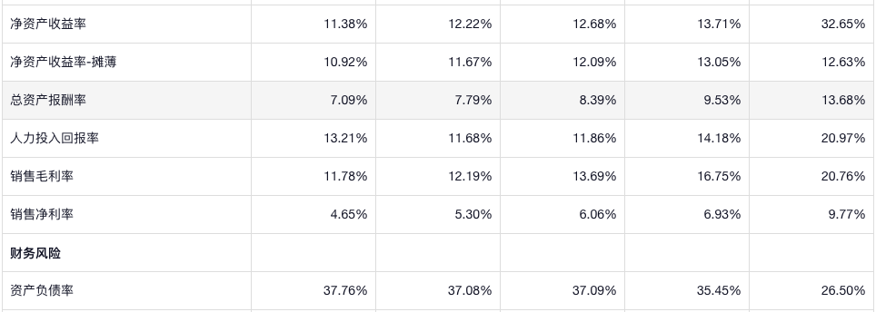 公司的净资产收益率不算低,利润率不高,利润率一直在下降,这有点不太好,负债率不高。