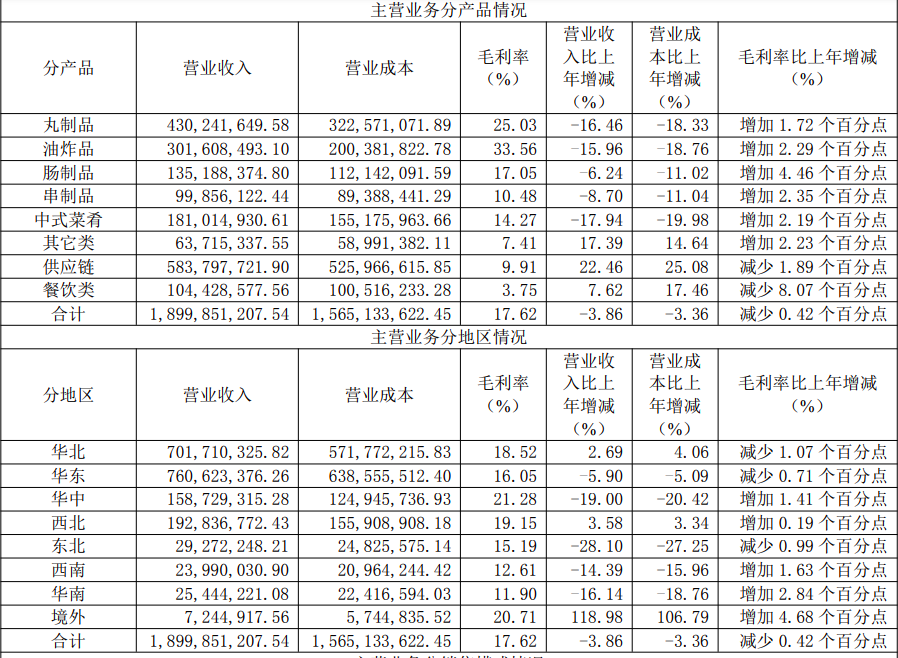公司主要从事速冻类预制菜类的丸类制品、肠类制品、油炸类制品、串类制品、菜肴制品等的研发、生产和销售。报告期内,公司加大了预制菜其他品类如常温休食类、健康餐类等菜肴制品的研发、销售以及供应链业务的推广运营。 公司速冻丸类制品主要包括鸡肉丸、鱼丸、四喜丸子等产品,肠类制品包括亲亲肠、桂花肠、腰花肠等产品,油炸类包括鱼豆腐、五福脆、甜不辣等产品,串类制品包括川香鸡柳、骨肉相连等产品,菜肴制品包括农家蛋饺、小龙虾等产品,供应链业务主要是面向酒店、校餐、团餐、连锁餐饮等单位的食材加工配送业务。