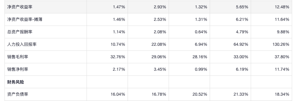 公司的净资产收益率是真的低,利润率中,毛利还挺高,但是净利润就很低了,负债率倒是很低