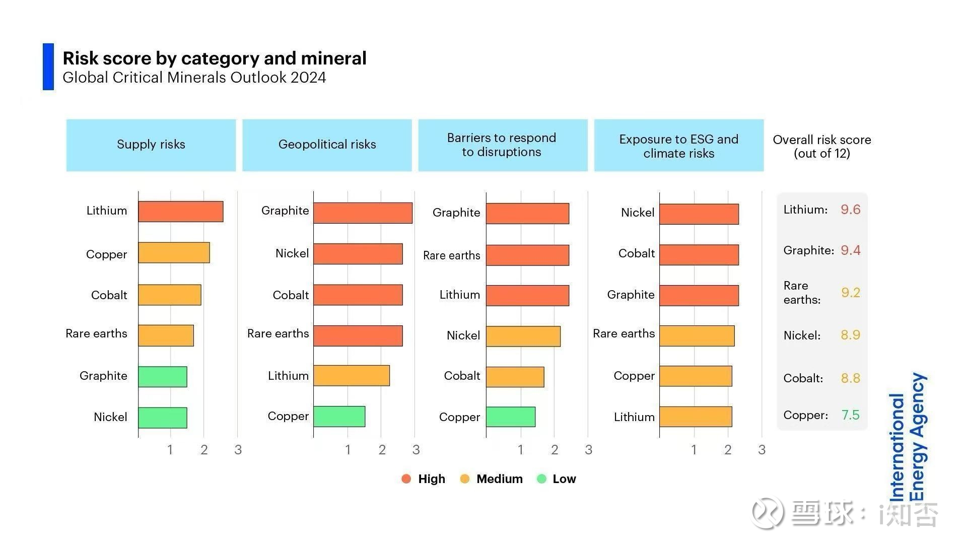 国际能源署(IEA)22号发的帖子,给各个能源关键金属做的供求矛盾危险系数排行榜,大家看看做参考吧,锂排第一没啥新意,有意思的是石墨由于地缘政治因素位列第二名 ……