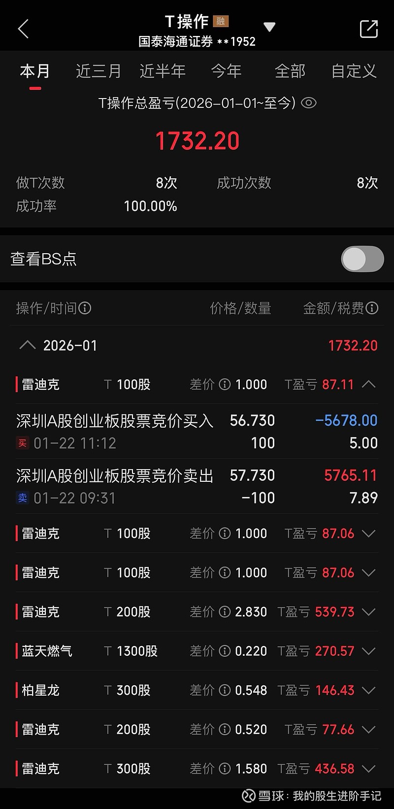 2.$雷迪克(SZ300652)$ 主要是赚波动的钱,当日T可以查到,还不包括隔日买卖的,继续持股等待。