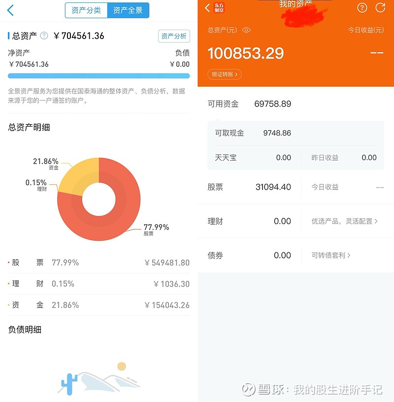 一、“资产负债表”(国泰海通主账户全景净资产70.46万元东财辅账户10.08万元合计80.54万元)