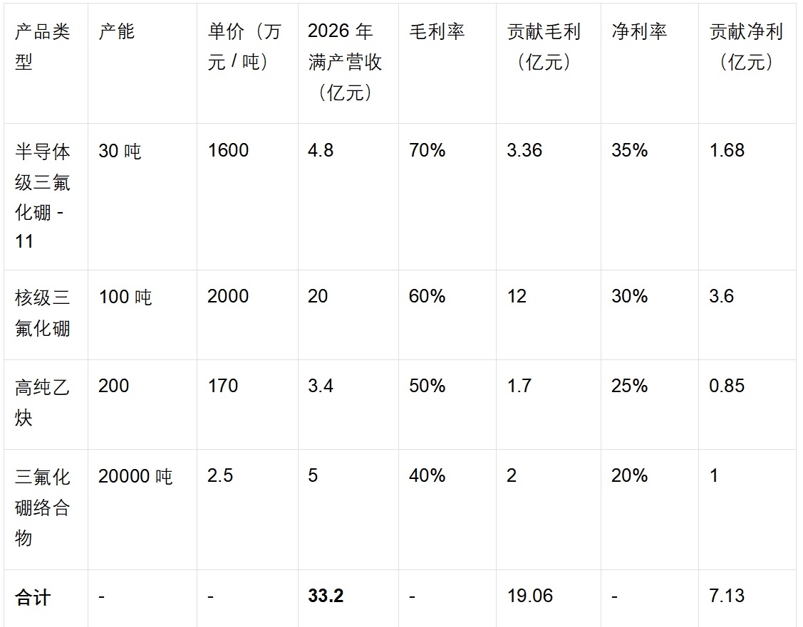 1. 营收增加值:2026 年满产后,三氟化硼业务将新增营收 33.2 亿元,使公司总营收突破 58亿元,较 2024 年实现 132% 的翻倍增长;