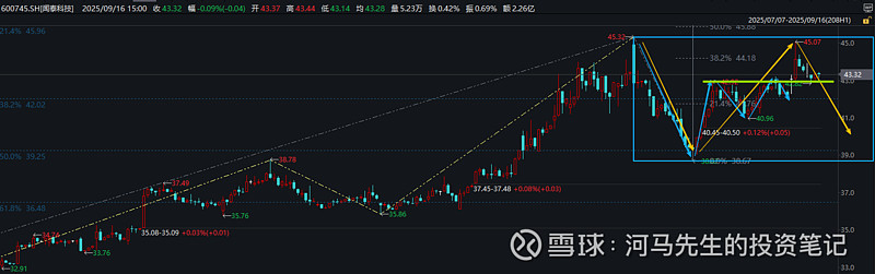 $闻泰科技(SH600745)$ 多唠一下这家伙(自带狗头保命,这里的环境已经不如从前了),总体感官上近期是“该强不强,但也不弱”,之前有说到,迟迟不放量走出3-5的话,那么3-4的结构就还有变化的可能,此前“强”的预期是图中蓝色箭头指向的“收敛三角形”,但如果这里下了5日线/43附近(因为均线是收敛的,容忍度高的看一下10-20日也可以,我说的太“没破绽”了),3-4就有可能演变成宽幅的三角形或箱体,即下图中黄色箭头指向的。依然是中长期选手忽略此条。