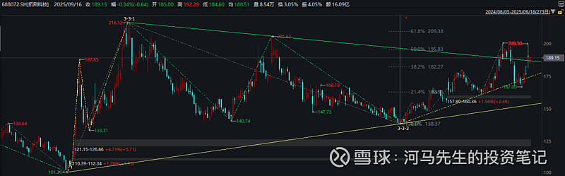 很久没有单独画老三的图了,我其实看好要走突破的,技术面核心的点是,大级别结构已经基本可以定性摆脱调整范畴了,叠加近期放量,情绪面其实也有催化,在大盘没有调整之前我还是格局下,有点担心这个位置拔一根大阳(就新高了)容易甩人。ps:对了,从结构上确实还是跟盛美突破前很像的,盛美也是连拉大阳完成的突破。