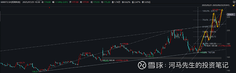 2-之前在“从盛美看设备中军主升”及后来的“更正”中提到,138-200是某级别大3浪的次一级1浪(5个子浪完整),167以来则是开启是次一级的3浪主升(ps:感兴趣的自行翻以前的帖子)