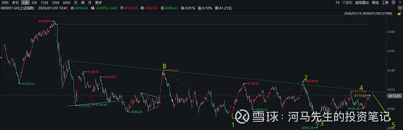 2、另一种情形如果选择向上越过趋势线压制,那么整个调整浪4可能周期就更长一些;