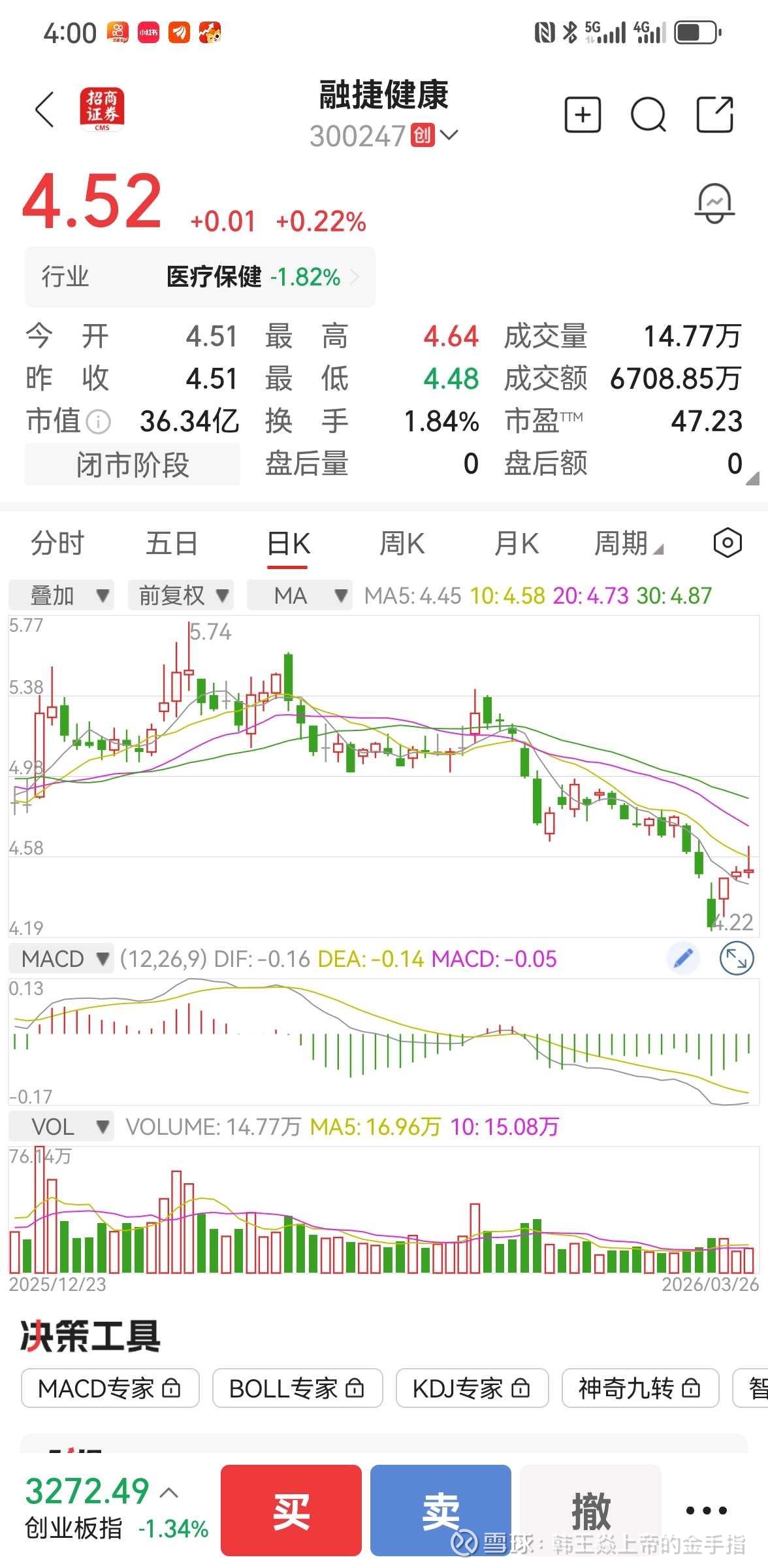 价格维度:当前股价4.51元,处于下跌趋势中。根据赢家江恩工具显示,当前支撑位4.28元,阻力位4.55元。价格在支撑位附近震荡,显示多空力量在此区域博弈。