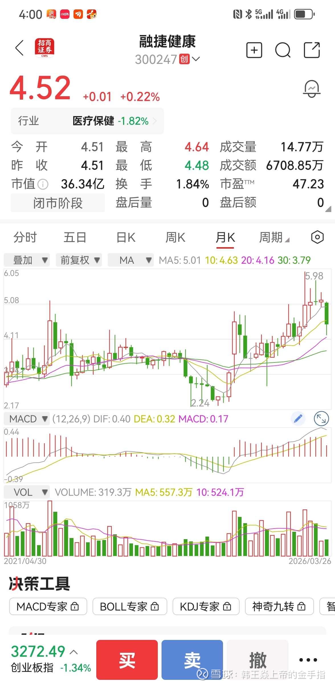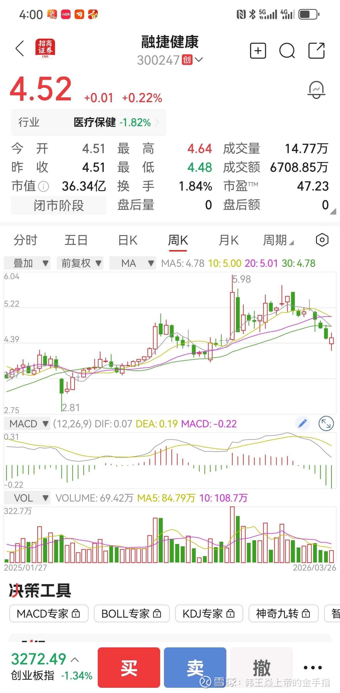 根据韩王时价系数理论,股票走势由价格(P)、时间(T)、能量(E)三维关系共同决定。基于对融捷健康(300247)当前三维状态的分析,我对未来一个月(至2026年4月下旬)的走势推演如下: