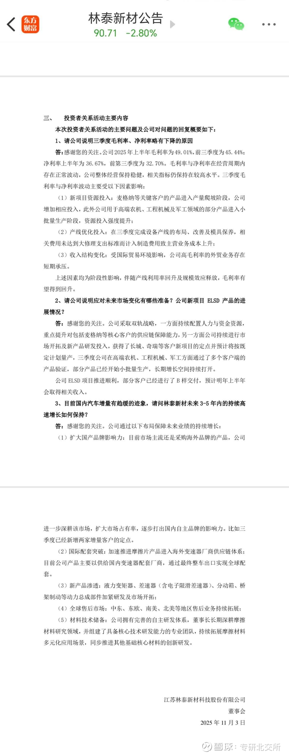 林泰新材今天发布的投资者关系活动记录表有亮点。
