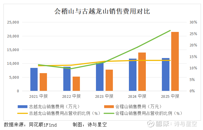 上半年,会稽山的销售费用为2.15亿元,同比增长53.69%;古越龙山为1.2亿元,同比增长1.06%。