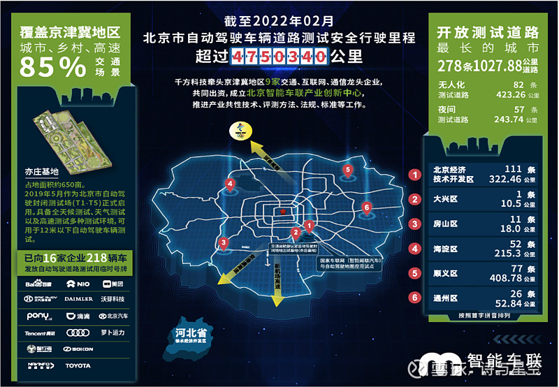 千方科技在北京亦庄建了个国家级的智慧汽车和智慧交通示范基地,面积达到650亩,覆盖了京津冀地区85%的路况和90%的高速路况,甚至包括乡村,开展车路协同的测试评估。