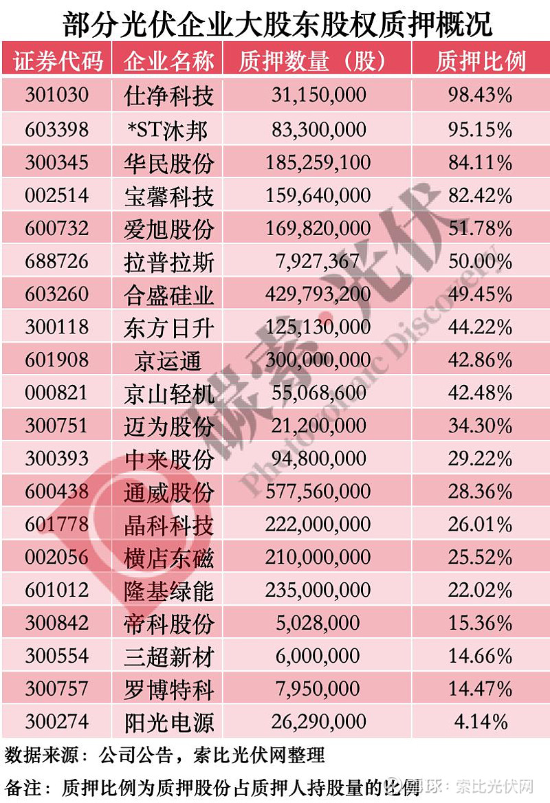 从质押用途来看,共有21起股权质押用于生产经营或者补充企业的流动资金,10起用于融资,其所涉及的企业大多为经营业绩显著承压的主产业链企业,比如合盛硅业、京运通等。而用于个人资金需求的16起股权质押中,像阳光电源、帝科股份这样的“绩优股”居多,但亦有像华民股份、仕净科技等陷入亏损泥潭的“追光者”。