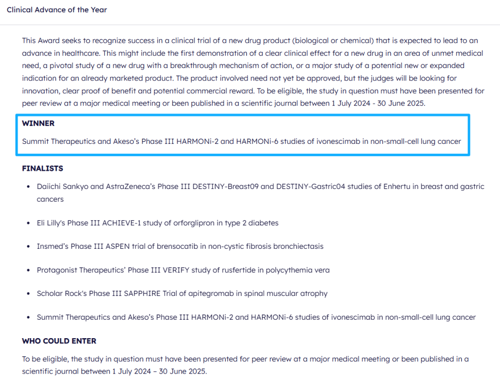 Scrip Awards本届“年度最佳临床进展” 大奖全球共有6款药物重磅研究入围,最终依沃西两项III期研究脱颖而出拿下大奖。全球入围该奖项的药物临床研究包括: