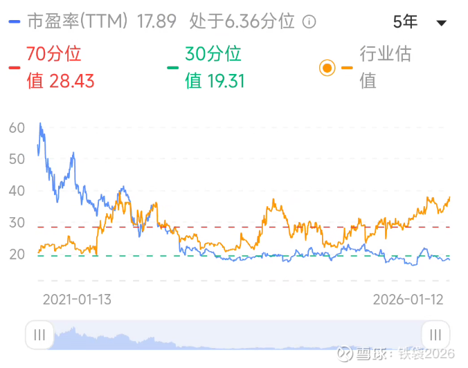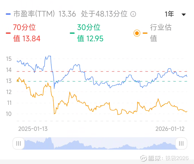 美的:PE (TTM) 13.436。历史百分位在 50% 左右,分红安全垫极厚,适合防守。
