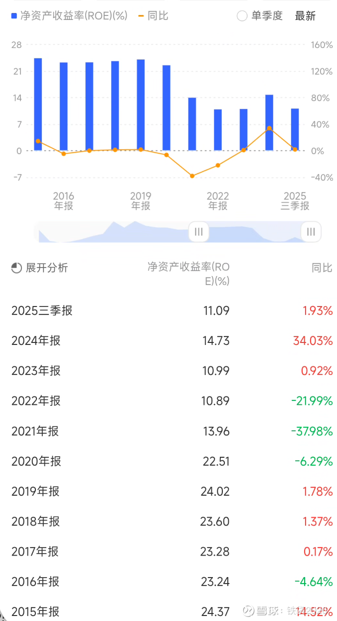 分析: 在2021年之前,恒瑞的ROE长期保持在20%以上,这是顶级“现金奶牛”的特征。2021-2023年受集采(VBP)和研发投入加大的双重挤压,ROE一度回落至 10.89% 的历史低点。
