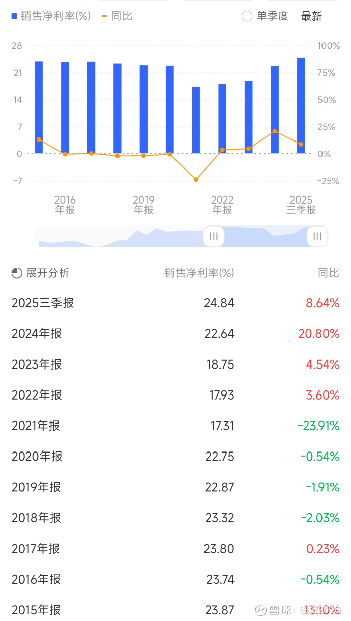 净利率: 2022年跌至 17.93%,2024年回升至 22.64%。在研发费用(人力投入回报率虽有波动,但依然维持高位)居高不下的情况下,净利率能快速重回22%以上,反映了管理层极致的成本控制能力和创新药的高溢价。
