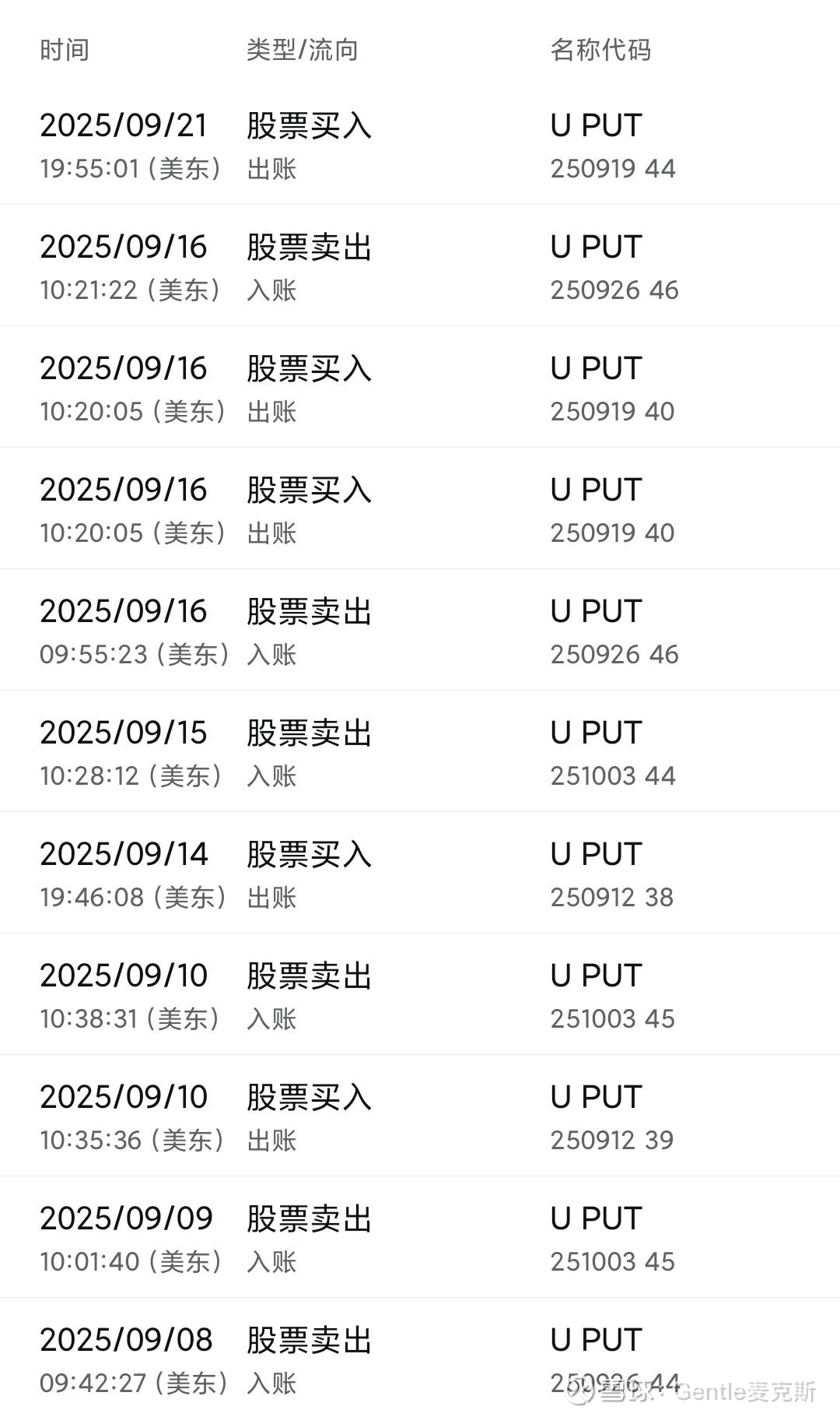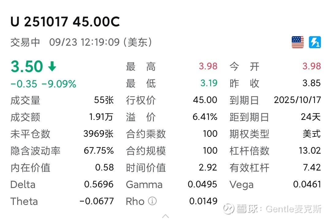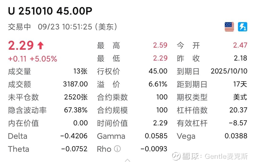举例来说,我持有的股票U的看跌期权,到期日为2025年10月10日,行权价45美元,当前报价2.29美元。