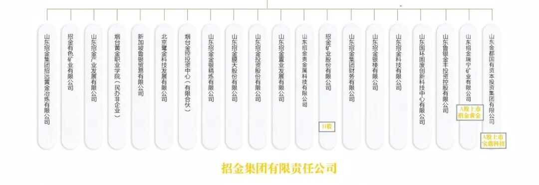 至此,集团公司共拥有全资企业7家,控股企业8家,参股企业9家。其中三家上市公司,分别控制了H股上市公司一家招金矿业;A股上市公司两家招金黄金、宝鼎科技;