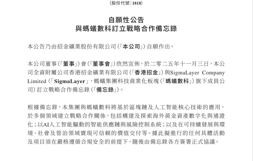 3、十一月初公司与蚂蚁数科签订合作备忘录,双方将基于区块链及人工智能核心技术的应用建立战略合作关系,发行海外黄金资产数字化与通证化;以AI人工智能驱动的智能供应链与风险控制系统;以及黄金稳定币的价值交付等项目。是唯一一家金企与大型科技公司签订合作备忘录的。