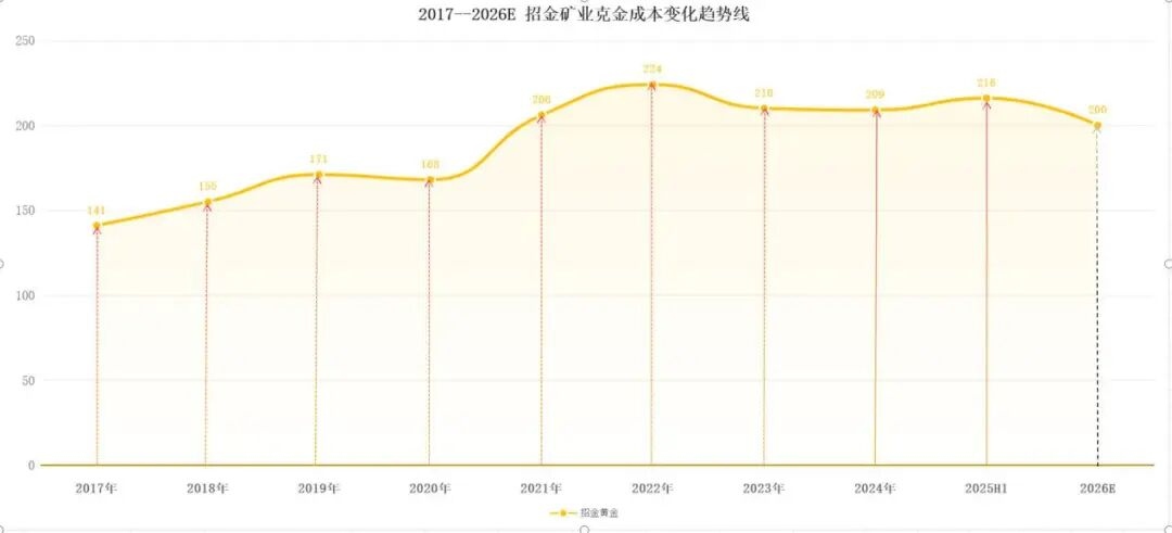 列位,细看克金成本曲线可以发现。21、22年曲线爬坡完成后,成本是一直比较稳定波动的。预估2026年全年克金成本可能210–230元/克左右,这是基于招金所属矿山性质决定的,其本部拥有多座小型、高品位矿山,在人力、采选规模,设计产能均较小,成本支出增长不多;海外两座露天矿,产量增长确定的情况下,成本也有望下降;还有海域金矿天然高品位,低成本;这一切情况就决定了,公司近年来的成本曲线一直保持比较平稳的状态。