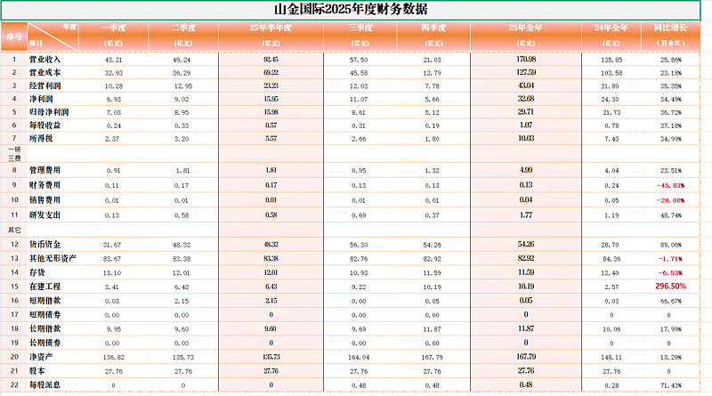 2025 年,公司实现营业收入170.98亿元,比上年同期增长25.86%;营业利润43.04亿元,比上年同期增长35.33%;归属于母公司净利润29.71亿元,比上年同期增长36.72%,年末货币资金增加26亿+达到54.26亿元,资产负债率22.91%,在建工程投资增加7.6亿+,海外重大项目顺利建设进行中。