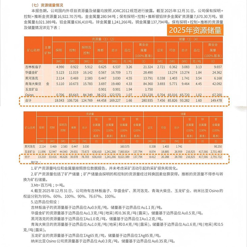 公司2025年度勘探资金投入1.11亿元,全部为资本化勘探投资,施工钻探工程11.18万米,年度探矿合计新增资源量金16.62吨(大柴旦、OSINO)、银296.57吨(玉龙矿业)、铅锌3.83万吨(玉龙矿业),当年新增资源量大幅超过生产消耗资源量。