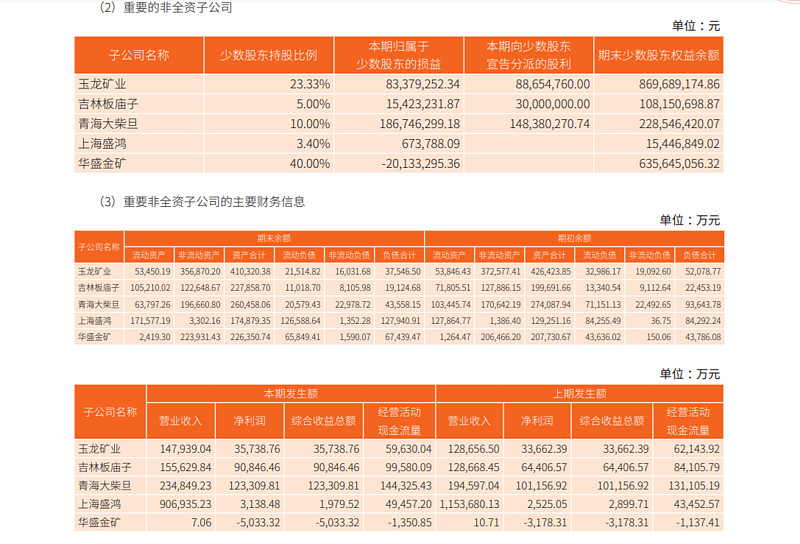 1、在重要子公司中,主要的利润来源于黑河洛克、吉林板庙子、青海大柴旦三大黄金矿产区,占总利润的88%+,王龙矿业占总利润的10%左右;华盛金矿亏损0.5亿。